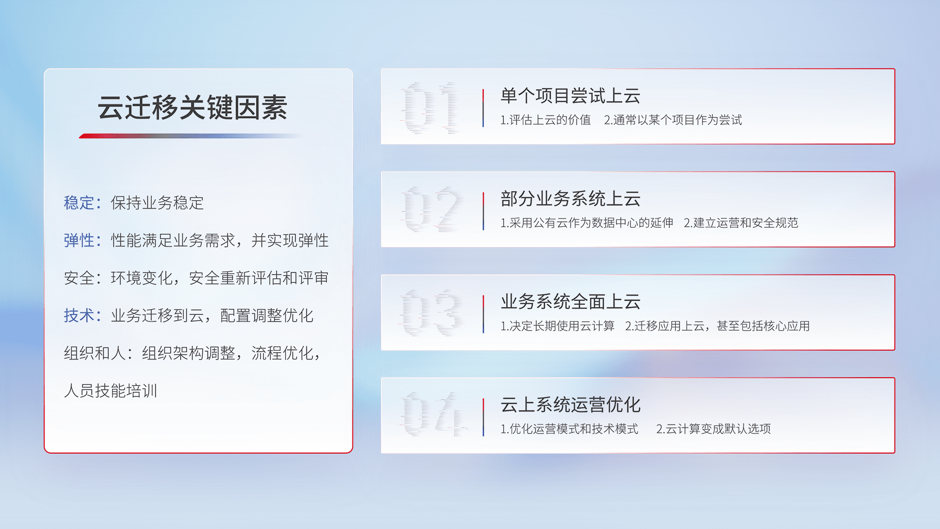 结合实际业务,,,,从规划设计、、云平台选型、、、、云原生改造、、数据迁移、、集成交付,,,,迁移全过程为客户识别最佳上云路径,,,做好风险识别管理,,设计网络架构、、身份权限、、、安全审计合规、、操作审计、、、日志审计、、、、监控告警策略、、、多站点容灾设计等,,对云上基础设施进行整体规划,,提升IT治理水平,,,,以满足弹性、、、、高可用、、高性能的需求。。。。